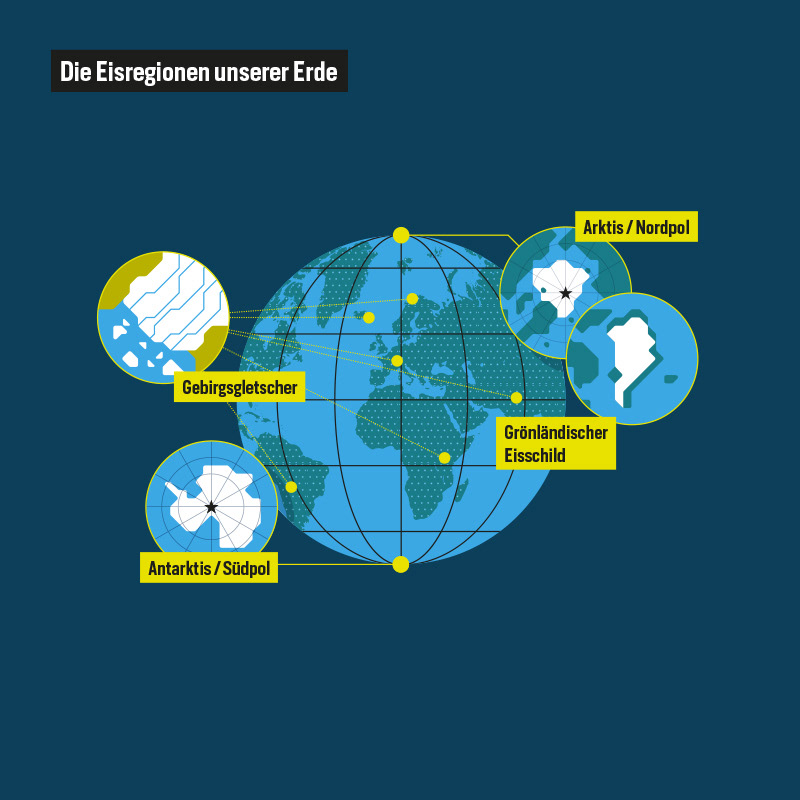 Infographics about the ice of the earth for »Focus« magazine.There is still plenty of land and sea ice, but it is melting at record speed due to climate change. The graphics and illustrations show these processes, the global distribution of ice and how it will develop in the future.