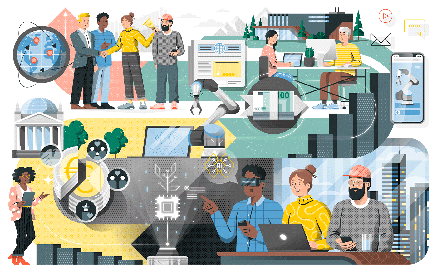 Corporate illustration & infographic about a typical foundation process of a startup company for the German startup association »Bundesverband Deutscher Startups«. The illustration was designed as part of the key visual for the new website relaunch of the association.